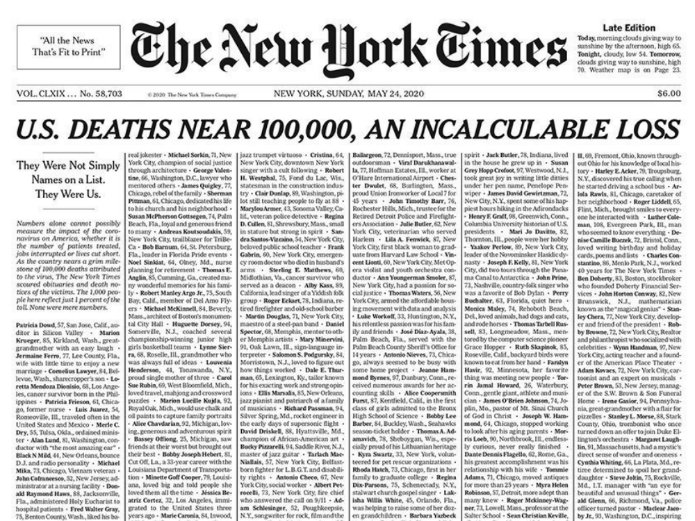 Iwill keep this mercifully short. On May 24, a Sunday, “The New York Times” pulled a cheap stunt. It filled its entire front page with the names of 1,000 of America’s nearly 100,000 coronavirus victims.