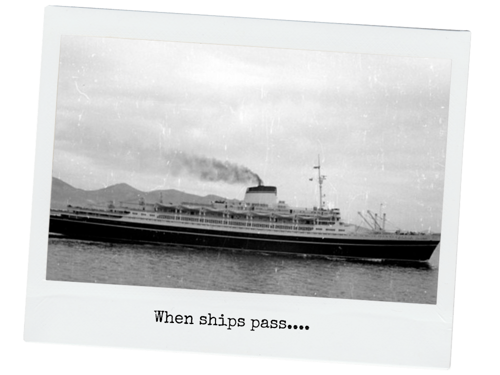 In June 1963 we sailed back to America. Our ocean liner, the “Cristoforo Colombo” westward bound, crossed paths with its sister, the “Leonardo da Vinci,” and the vessels passed so close that people could actually shout greetings, wishing well to the comers and the goers. Only afterward did it strike me that I had no idea on which side I was, coming or going.
