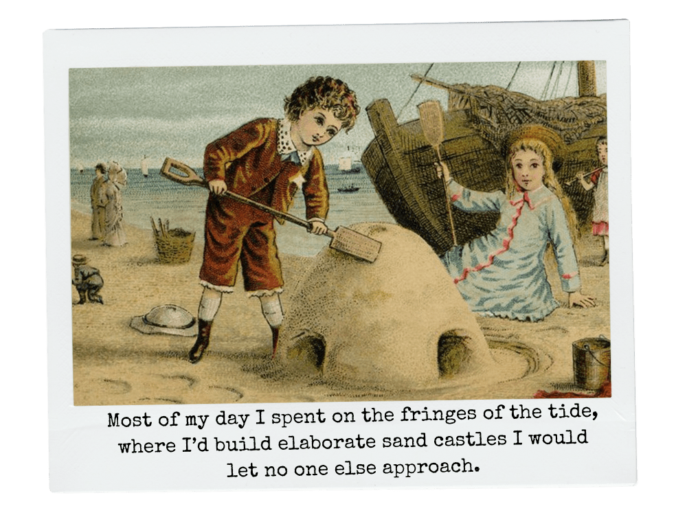 Most of my day I spent on the fringes of the tide, where I’d build elaborate sand castles I would let no one else approach lest they distract me from my latest turret and the twigs I had collected from nearby fields to act in the stead of cannons. I was a tiny military strategist of the highest order, consumed with building his empire, which all the world awaited to see at its peak, at least in my mind. All I made I assumed would later win the praise of my elders, men and women alike, those who occupied the space my father called “real life,” a real life that at that time was foolishly uninterested in the magnificence of my meticulous beach work. The value of my enterprise they could only learn over time, evidencing a principle defect of adults: they failed at excitement, or had forgotten how to understand it.