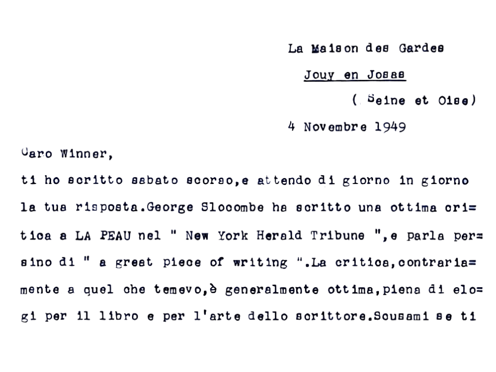 By late 1949, Italian author Curzio Malaparte (born Kurt Erich Suckert to a German Protestant father in Prato) had settled in Jouy en Josas outside Paris. Determined to see his latest novel “La Pelle” translated into English and published in the United States, he sought assistance from American friends, among them the journalist and political essayist Percy Winner, who then lived in New York City and would later become the Paris-based foreign editor of The New Republic magazine.