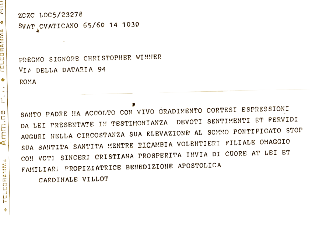 While watching him speak gently to gathered crowds during his Sept. 14, 1978 installation Mass, I decided to send him a deeply personal congratulatory telegram, based on my trip north. A day later, unexpectedly, I received reply from the pope, via his French chamberlain, or camerlengo, Cardinal Jean-Marie Villot.