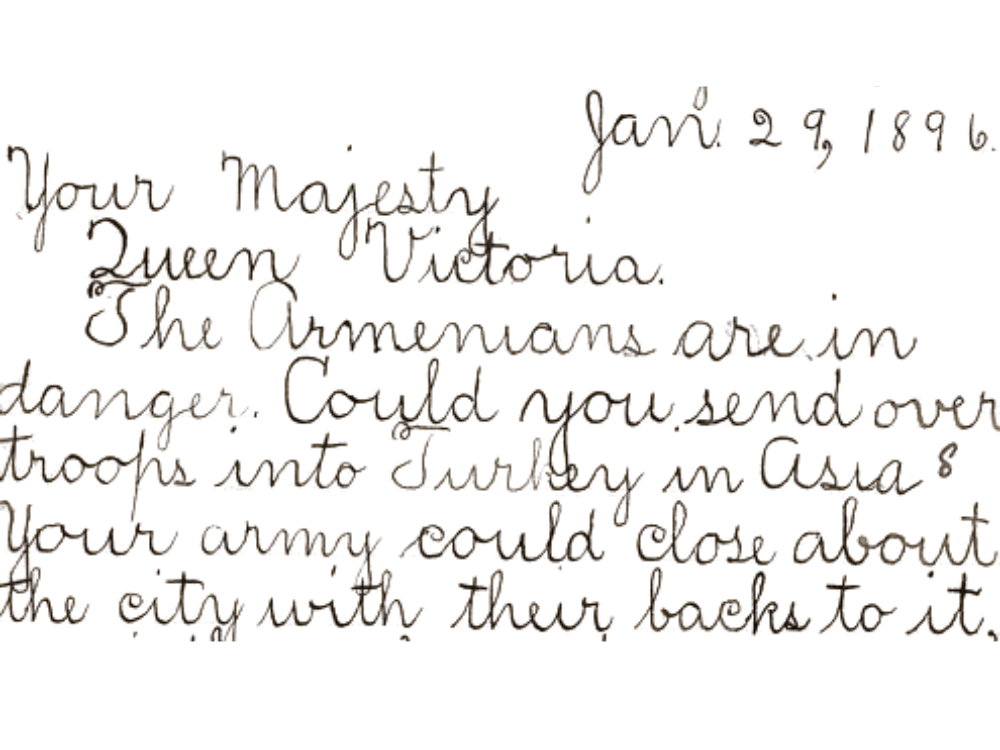 On Yom Kippur in 1896, Turks attacked a synagogue where Jews had given Armenians sanctuary. The unusually cold winter of 1895-1896 brought famine. The Armenians were truly starving when my grandfather wrote to Queen Victoria in January of 1896.
