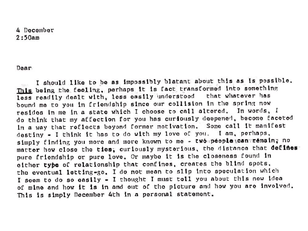 I should like to be as impossibly blatant about this as is possible. This being the feeling, perhaps it is transformed into something less readily dealt with, less easily understood — that whatever has bound me to you in friendship since our collision in the spring now resides in me in a state which I choose to call altered. In words, I do think that my affection for you has curiously deepened, become faceted in a way that reflects beyond former motivation. Some call it manifest destiny — I think it has to do with my love of you. I am, perhaps, simply finding you more and more known to me — two people can remain, no matter how close the ties, curiously mysterious, the distance that defines pure friendship or pure love. Or maybe it is the closeness found in either type of relationship that confines, creates the blind spots, the eventual letting-go. I do not mean to slip into speculation which I seem to do so easily — I thought I must tell you about this new idea of mine and how it is in and out of the picture and how you are involved. This is simply December 4th in a personal statement.