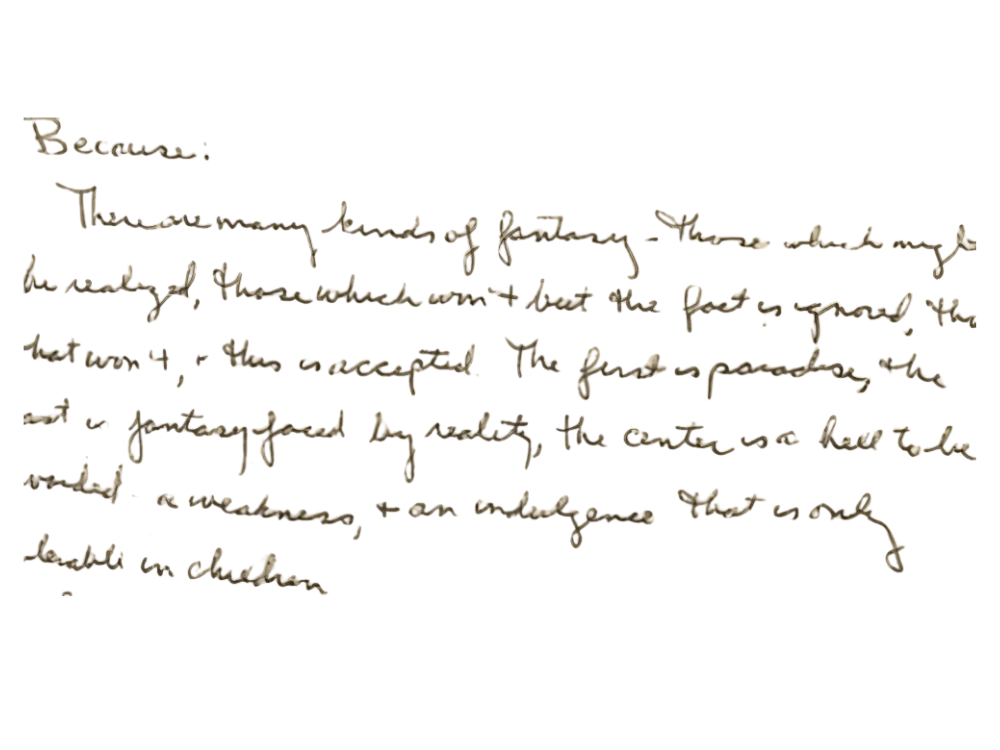 There are many kinds of fantasy — those which might be realized, those which won’t be but the fact is ignored, those that won’t, + this is accepted. The first is paradise, the second is fantasy faced by reality, the center is a hell to be avoided — a weakness, + an indulgence that is only tolerable in children.