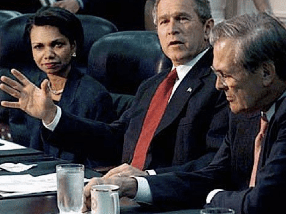 President George W. Bush, here with Condoleeza Rice and Donald Rumsfeld, draws mixed reviews among Italians.